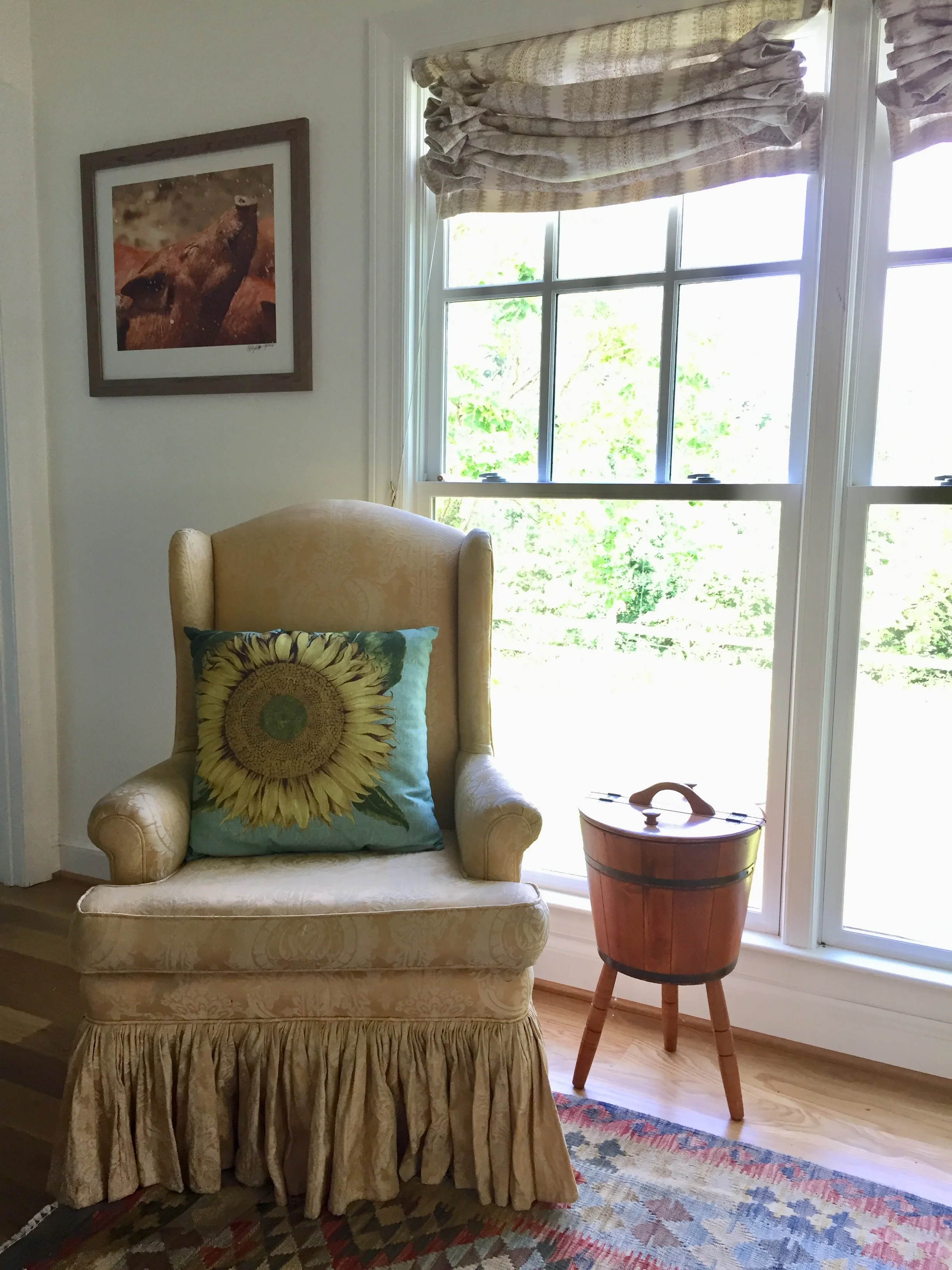This slipper chair was a floor sample I purchased for next to nothing about 15 yrs ago. The little wooden sewing table belonged to my grandmother who taught me how to do embroidery when I was a child.