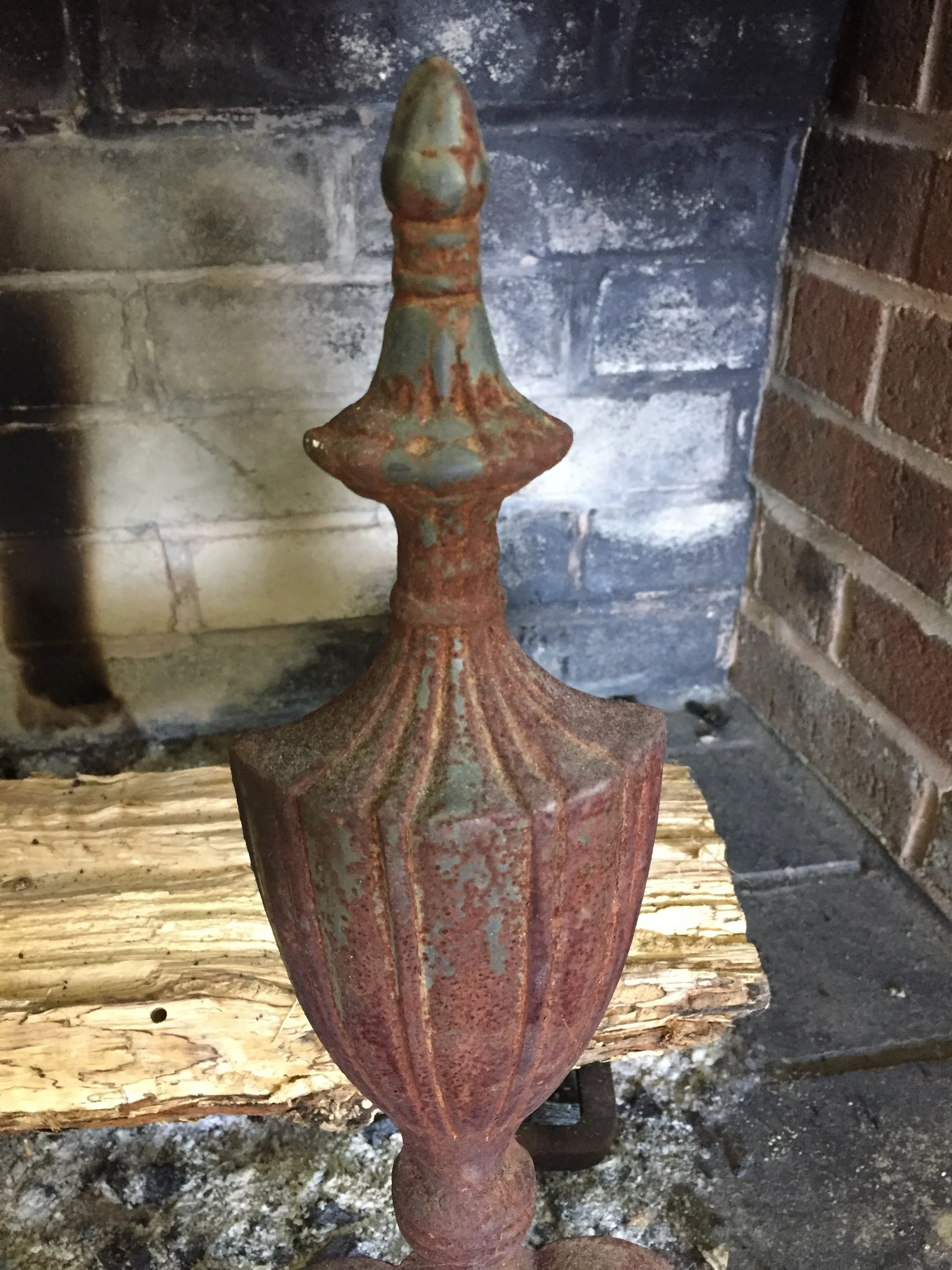 The bedroom has a working fireplace. These perfectly rusted and aged andirons were found in Salvagewrights, an architectural salvage shop in Orange Virginia. I know this isn’t the best photo of them, but the fireplace was full of ashes and I didn’t want to clean it :)