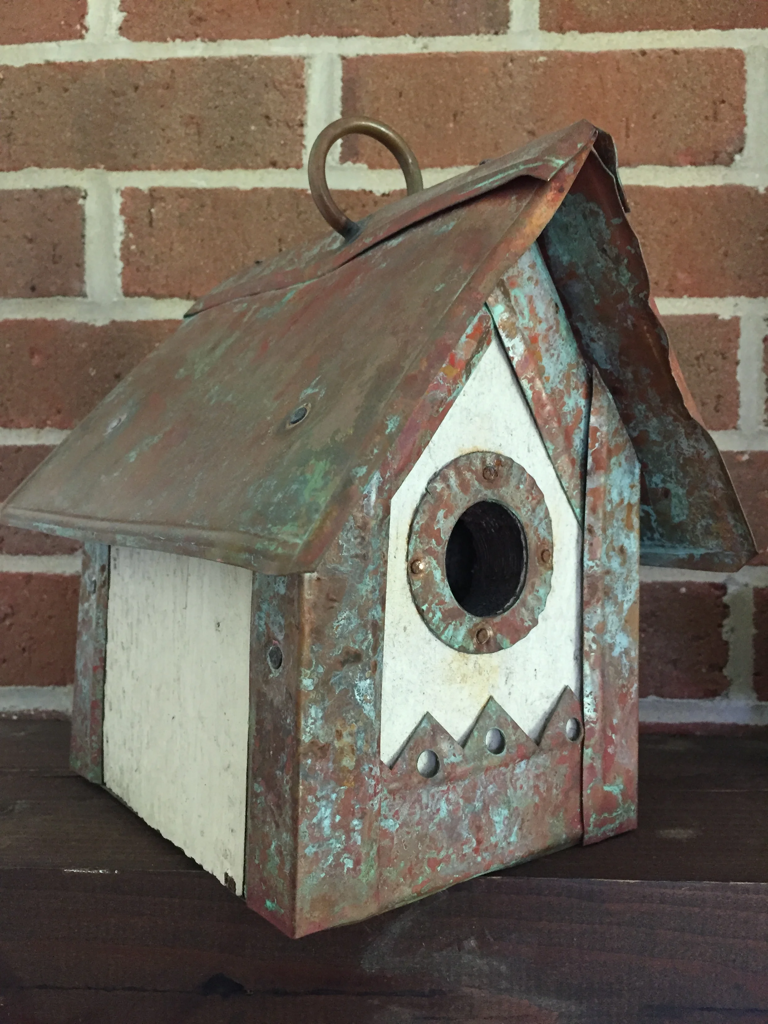 One of my brothers gave me this birdhouse years ago. It is made from salvaged copper and wood. It used to live in the recreation room of our previous house, but has found a much more agreeable home on the mantle of the bedroom fireplace.