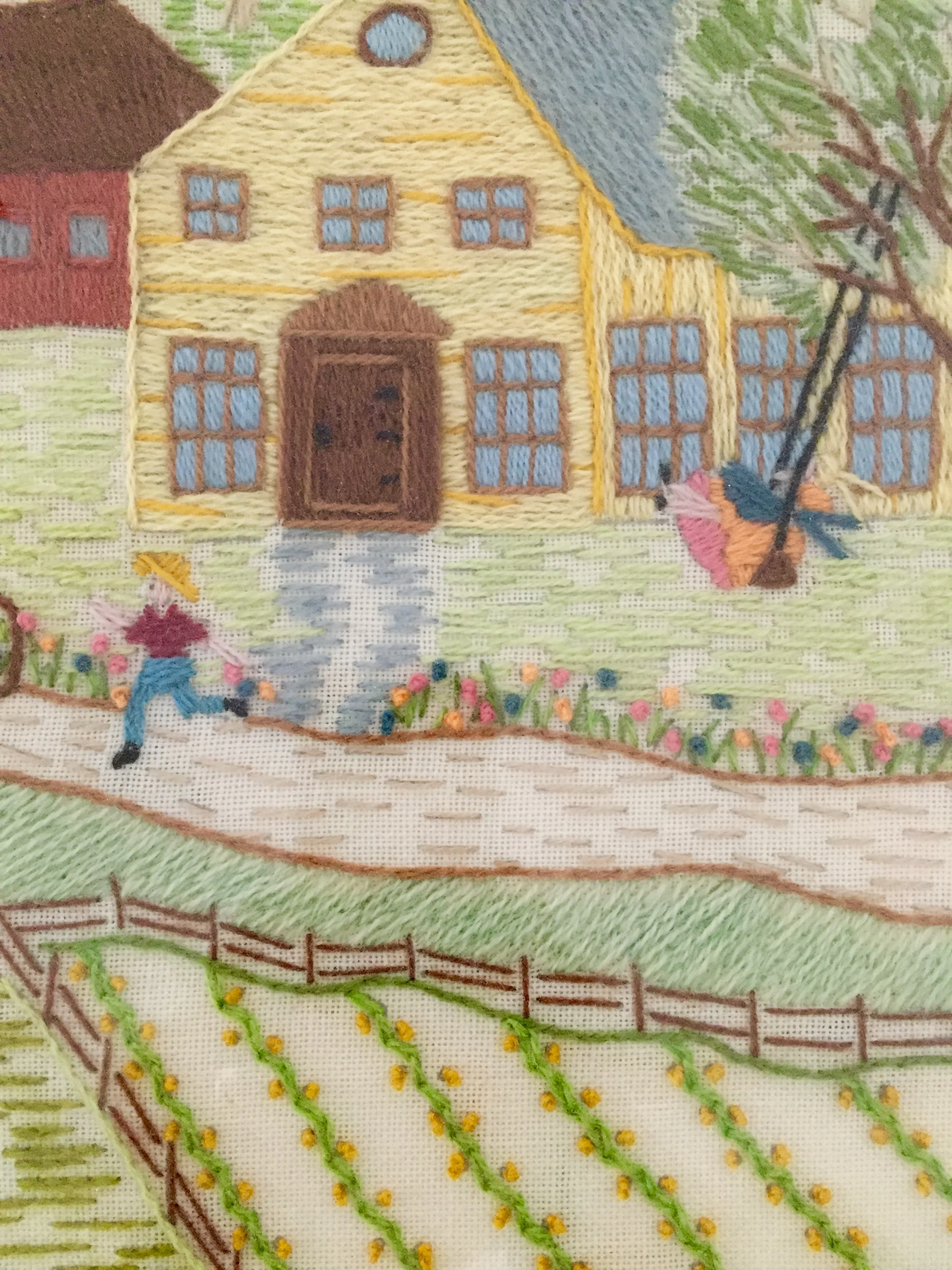 The framed needlework on the mantle is crewel embroidery. I purchased the kit when I was in high school! I didn’t start it until I was out of college. Worked on it off and on for years and completed it in 1999. I loved the scene depicted here even in high school, and now it is a good representation of my life. Crazy how life works.